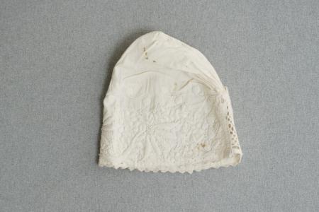 A258. dec. 1929 Ormsö Tanu Huvudbonad. Lärftshatt, broderad med plattsöm i bomull. Troligen barnstorlek. Kommentar: Små fläckar i tyget. B: 19,5 cm, H: 22 cm.