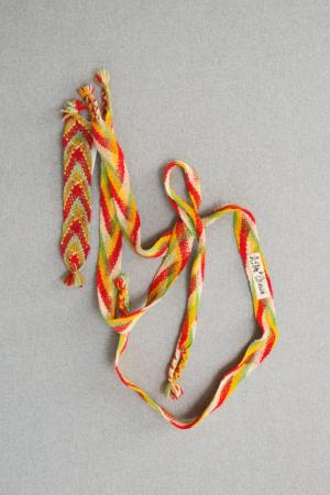 A264. dec. 1929 Ormsö a-b) Läggiband a+b språngande band i granna färger Kommentar: B: 2,5 cm, L: 86 cm + flätningen: 5,4 cm.