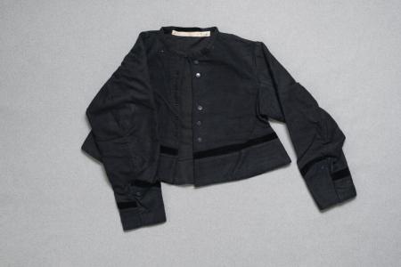Tröja (kvinno) mörkblå av tunt vadmalstyg, av nutida snitt smal halslinning, 6 blå ben-knappar i en rad framtill, söm på axeln o. under armen, sneddade ärmar, ett svart sammetsband