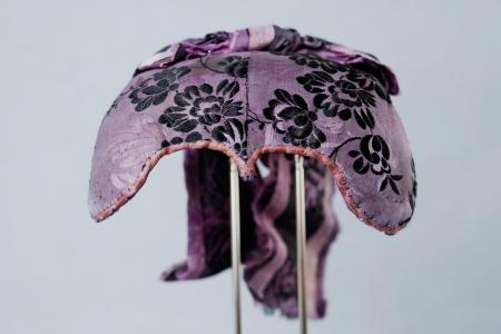 Styckomössa av gredelinblommigt siden med gredelina o. svarta blommor o. nackrosett o. långa nedhängande band.