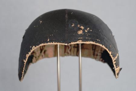 Kommentar: Stor svart bindmössa, svagt hjärtformad, tre stickningar framtill. Fem böjda veck. Foder av randig brun kattun, dragband av tvinnat lingarn. Mycket slitet tyg. B: 16 cm, H: 10 cm.
