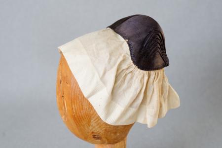 Kommentar: Bindmössa av svart sidensatin. Nästan rak i framkanten, som dekoration två stickningar i grupper. Foder av grönrödrandigt tyg. Goffrerat stycke, fastsytt. Välbevarade. B: 17 cm, H: 6 cm. Stycke; B: 66 cm, H:13 cm.