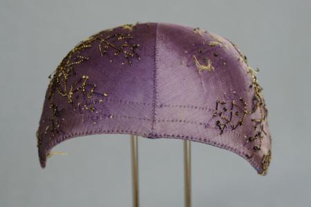 Kommentar: Lila sidenmössa med metall- och paljettbroderier. Nästan rak i framkanten, två stickningar som dekoration, sex böjda veck. Foder av randigt fint linne. Dragband av kantband. En del av broderierna saknas. B: 16 cm, H: 6,5 cm.