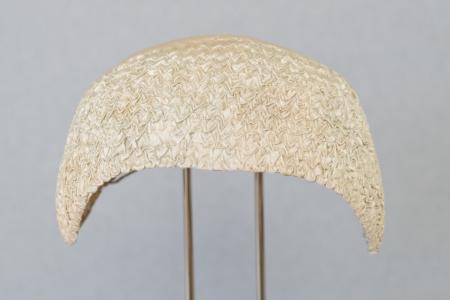Kommentar: Liten ljus bindmössa. Framtill tyget rynkat ett stycke, baktill slätt siden. Rak framkant, foder av tryckt rött kattun med ljusa prickar. Dragband av tvinnat garn. Små hål i tyget. B: 16 cm, H: 7 cm.