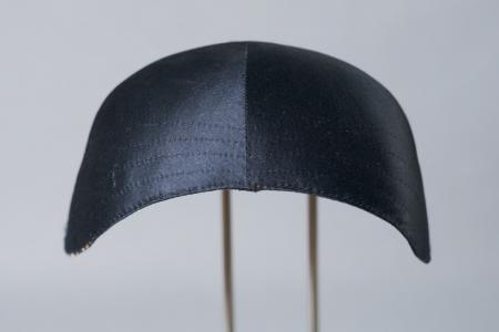 Kommentar: Helsvart, liten bindmössa i siden. Rak framkant. Fem veck i vinkel. Fyra stickningar som dekoration, dragband av tvinnat lingarn. Foder av tryckt randig kattun. B: 15 cm, H: 4,5 cm.