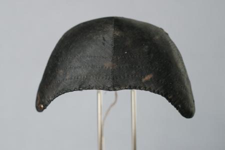 Bindmössa av svart slätt siden. Tre stickningar som dekoration, nästan rak i framkanten, sex kraftigt böjda veck, dragband av tvinnat lingarn, oblekt linnefoder. Några blekta fläckar i tyget. B: 17 cm, H: 6,5 cm.