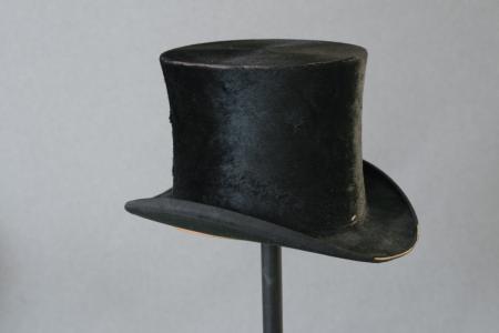 Kommentar: Sidenfelb, inget hattband. Kanterna något slitna, svettremmen lossnat, silkesfodret slitet. B: 18 cm, H: 16 cm, brätte: 5 cm.