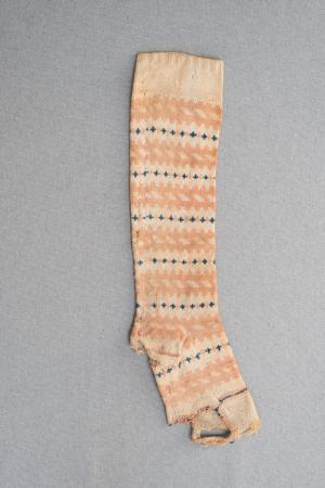 Kommentar: Strumpa av bomullsgarn, mönster i blått och ljusrött på vit botten. Trasig. B: 48 cm, H: 12 cm.