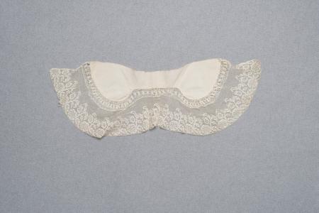 Kommentar: Tät bomullslärft i stycket, ena kanten ofållad, kraftigt formad framkant enligt mössans kant. Färgen gulnat. B: 67 cm, H: 12 cm, spets: 2 cm + 7 cm.