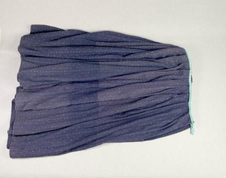 Kommentar: Vardagsdräkt. Tvärvecket borttaget, färgerna bleknat. Linning av rutigt bomullstyg. Lissorna i linningen av blommig kattun. B: 46 cm, H: 90 cm.
