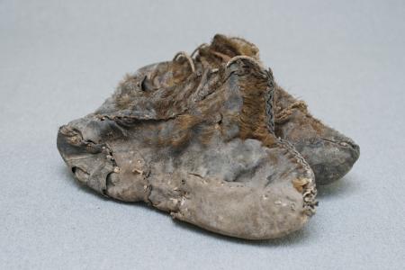 ”Själatossor” av ogarvat sälskinn med den håriga sidan utåt. Den ena sömmad av två stycken, den andra av ett stycke som hopvikts under foten och hopsömmats fram- och baktill.