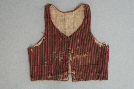 Liv av halvylletyg, smala ränder i rött, svart, svagt grönt och vitt. En del ränder tandade. Hög i ryggen, rundade framkanter. Ränderna löper i vinkel i ryggen, sidsömmarna slutar i skört. Tvärveck åtta cm från nedre kanten. Inga knappar kvar. Knapphålen tränsade i rött. Foder av grov och rätt så gles linnelärft. Mycket sliten. B: 43 cm, H: 34 cm.
