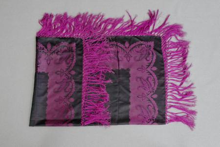 Sidensjal med svart botten och orientaliskt mönster i lila.