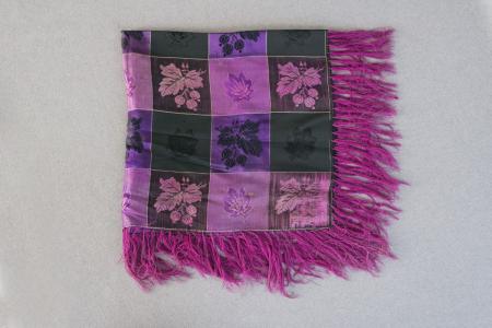 Kommentar: Jacquardvävd sidensjal i rutor. Blad och krusbär i rutorna i rosa, lila och svarta färger. Rutorna markerade med vit rand. Frans i lila. B: 68 cm + 10 frans + 67 cm + 10 cm frans.