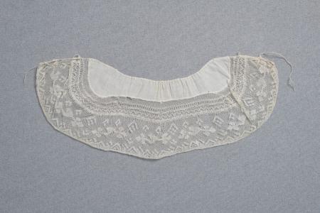 Kommentar: Smal maskintyll, tyget goffrerat, knytband i båda ändarna av tvinnat lingarn. Raumospetsarna ”Kouknatto” och ”Frimodiglai”. B: 14 cm, L: 45 cm.