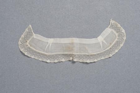 Kommentar: Styckespets av rakt tunt bomullstyg, formad med fyra sydda veck, kanten av maskinvävd tyllspets. Välbevarad. B: 2,5 cm, H: 8 cm, L: 56 cm.