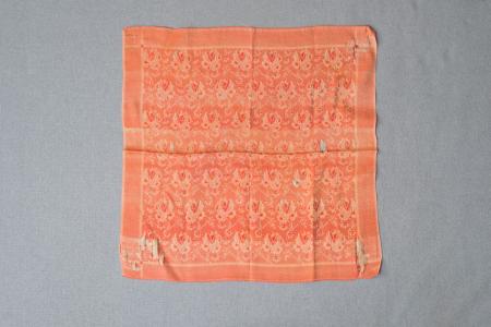 Kommentar: Vit-orange duk i bomull. Jacquardvävd, rosor i mitten. Kant utan större mönster. Flera revor i varpriktningen. 52 cm x 52 cm.