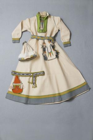 Kolt, huvudbonad med päls, krage, två olika bälten med fastsydd kjolsäck. Vitt vadmal med gröna passpoaler, dekoration i olika gröna färger och orange vadmal. Tofsar i guldfärgat band eller vadmal, med stjärnor av tenn. B: 120 cm, H: 135 cm, ärmlängd: 54 cm.