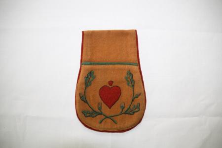 Kjolsäck, gul botten, brunröda och gröna kanter, broderad. Från Pojo.