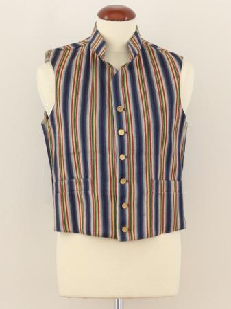 Väst av ett mångrandigt tyg i mörkblått, vitt, gredelint, gult och grönt, snitt som Kimitodräktens, mörkblå snören i ryggen.