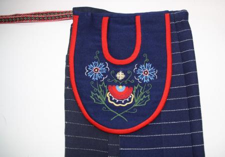 Blå med röda kanter, rundad sidöppning. Broderier i rött, blått, gult, vitt, grönt (avvikande broderi från 46.5.1). Från Kronoby.