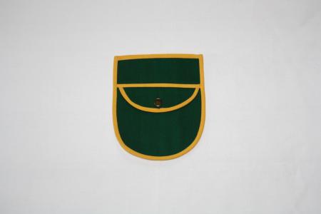 Kjolsäck, dubbelficka med rent lock, grön botten, gula kanter. Från Sundom.