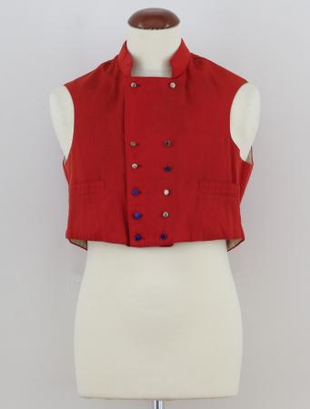 Heikels ursprungliga anteckning: Väst helröd med uppstående krage , tätt knäppt under hakan, 6 par blå spegelglasknappar i två rader två rakt sydda fickor, rygg av samma tyg, svarta snören.