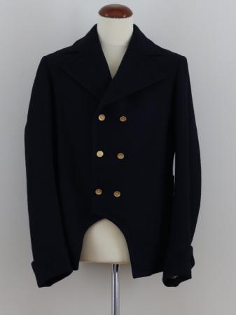 Rock av mörkblå vadmal med nedvikt krage, långa stora upplsag, 5 par mässingsknappar två rader, som närma sig varandra nedåt, frackfason nedtill, ärmuppslag utan knappar, två fickor, mittelsöm och svängda sidosömmar i ryggen, skört med 2 knappar i ryggen.