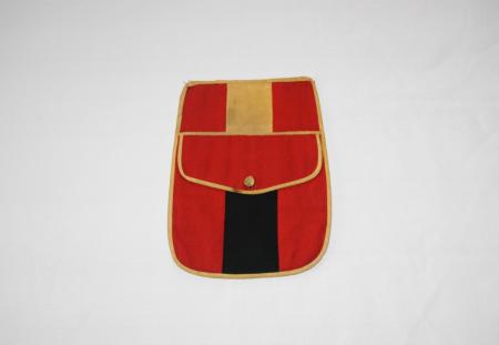 Kjolsäck, röd med gula kanter med lock, knäppt med en knapp. Från Sideby.