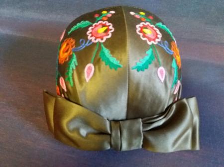 Mörkgrön med broderier i rosa, rött, orange, brunt, blått och gult. Från Helsinge.