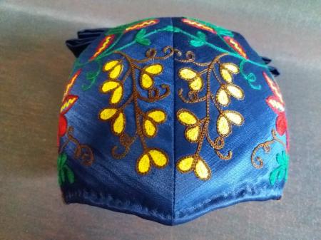 Mörkblå med broderier i rött, gult, brunt, ljusblått och grönt. Från Degerby.