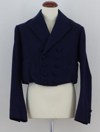 Heikels ursprungliga anteckning: Rock av ljusare blå vadmal med nedvikt krage med 5 par översydda knappar, av vilka 4 kunna knäppas, ärmuppslag, 1 knapp knäppes genom detta och 1 är sydd ovanom det mittelsöm och svängda sidosömmar i ryggen, inga skört, kort, kort, 2 snett sydda fickor. Från Borgå.