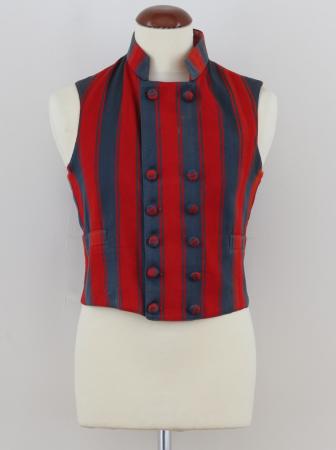 Heikels ursprungliga anteckning: Väst av randigt tyg i rött och mörkblått, med uppstående krage, tätt knäppt under hakan, 1 + 5 par överklädda knappar, 2 rakt sydda fickor, tillsnörs med röda snören.