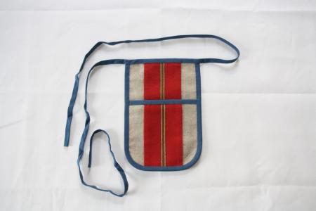Botten i linne med bred röd rand i mitten. Blåa kanter. Broderad smal mittenrand. Från Mariehamn.