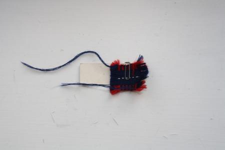 Vävt band på blått botten, röda kanter med vit mittrand. Tillverkat av Orre Villgren. Fån Kumlinge.