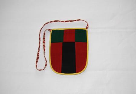 Kjolsäck med enkel ficka och med band. I färgerna grönt, svart och rött. Med gula kanter. Från Bergö.