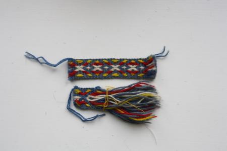 Vävt band. Blå botten med inslag i vitt, rött och gult. Från Borgå.