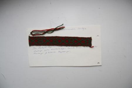 Vävt band, mörkröd botten med mörkgröna inslag. Fastsatt i en kartongbit. Från Korpo.