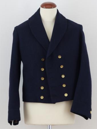 Mörkblå, sjalkrage, midjelång, knäppt med 5 par stora stölingar, ärmuppslag med 1 liten stöling, i ryggen sidsömmar med skörtveck prydda med 2 stora stölingar.