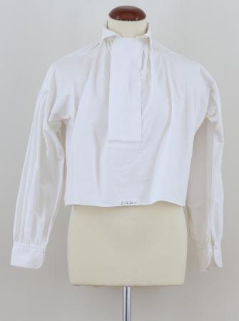 Heikels ursprungliga anteckning: Skjorta med nedvikt krage med rundade hörn, brett motveck, ärmlinningar med rundade hörn och en knapp, axelkokett.