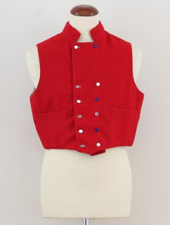 Röd, ståkrage, knäppt med 6 par turvis blå och gula spegelglasknappar, så kort att skjortan syns, ryggstycke av naturfärgat linnetyg.
