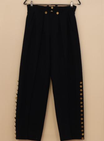 Mörkblå långbyxor med smal lucka, knäppt med 2 stora stölingar, ficka i vardera sidsömmen, längs sidsömmen stora stölingar från vristen till knäet.