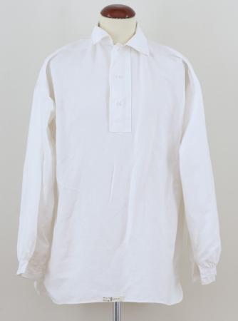 Hel- eller halvlinneskjorta av vit lärft. Skjortan har axelförstärkning, hög delvis nedvikt krage med framlist samt hals-och ärmspjäll. Vida ärmar med stripade rynkor både vid ärmlinningen och på axel.