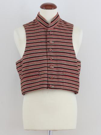 Väst av halvylletyg, tvärrandigt med rosengångsmönster i bruna och matta färger. Västen har 7 överklädda knappar i en rad och låg krage. Ryggstycket av ofärgat linne.