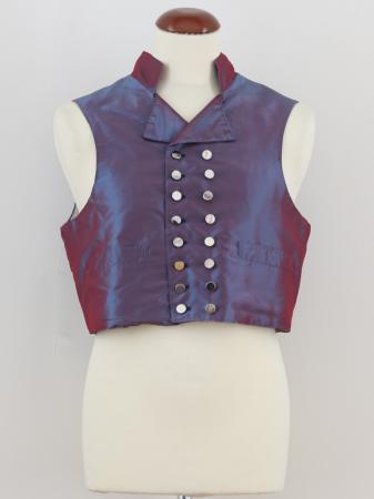 Väst av siden skiftande i blått och rött, ståkrage och slag, knäppt med 8 par små mässingsknappar, så kort att skjortan syns.