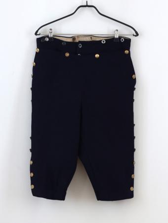 Knäbyxor, mörkblå, bred lucka knäppt med 4 stora ankarknappar, 11 ankarknappar längs sidsömmen varav de tre nedersta kan knäppas vid knäsprundet.