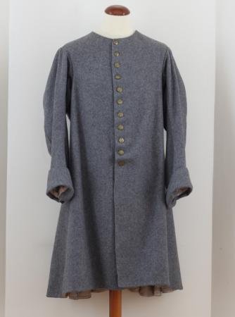 Grå rock, når nedanom knäet, utan krage, knäppt upp till halsen med stora mässingsknappar, i ryggen mittsöm med sprund och svängda sidsömmar som bildar skört av samlade veck från midjan neråt, breda ärmuppslag.