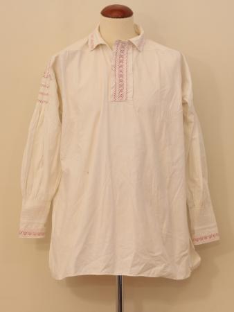 Skjortan har nervikt krage med spetsiga hörn, sprund med bred framlist, axelföstärkning och ärmlinning prydd med hålsöm med rött tyg under. Ärmar veckade upptill och nersydda med daldersömmar, långa spripade rynkor vid ärmlinningen.